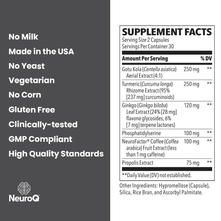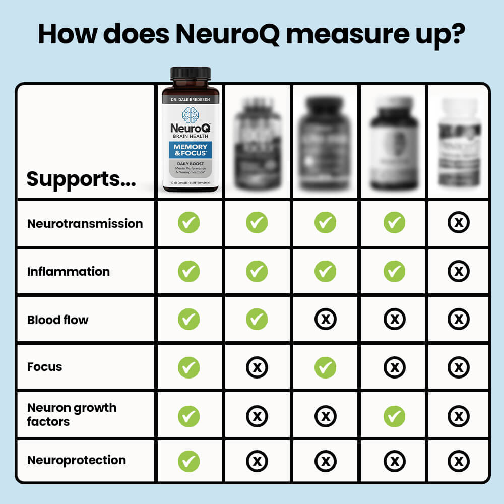 Based on decades of research, neurologist Dr. Dale Bredesen identified the key ingredients for enhancing memory and focus. NeuroQ Memory and Focus ingredients work together synergistically to protect long-term brain health, increase blood flow, clear toxins, and support healthy brain cells.*